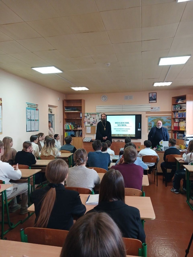 Во встрече приняли участие С.И.Притула, методист методического центра управления образования, Н.И.Михайленко, учитель истории и обществознания школы, и иерей Николай Новохатских, руководитель проекта «Юный краевед г.Феодосии», настоятель храма святого преподобного Агапита Печерского врача безмездного села Ближнее Республики Крым Феодосийской епархии. Отца Николая - выпускника специализированной школы №2 - с радостью встретили его бывшие учителя!